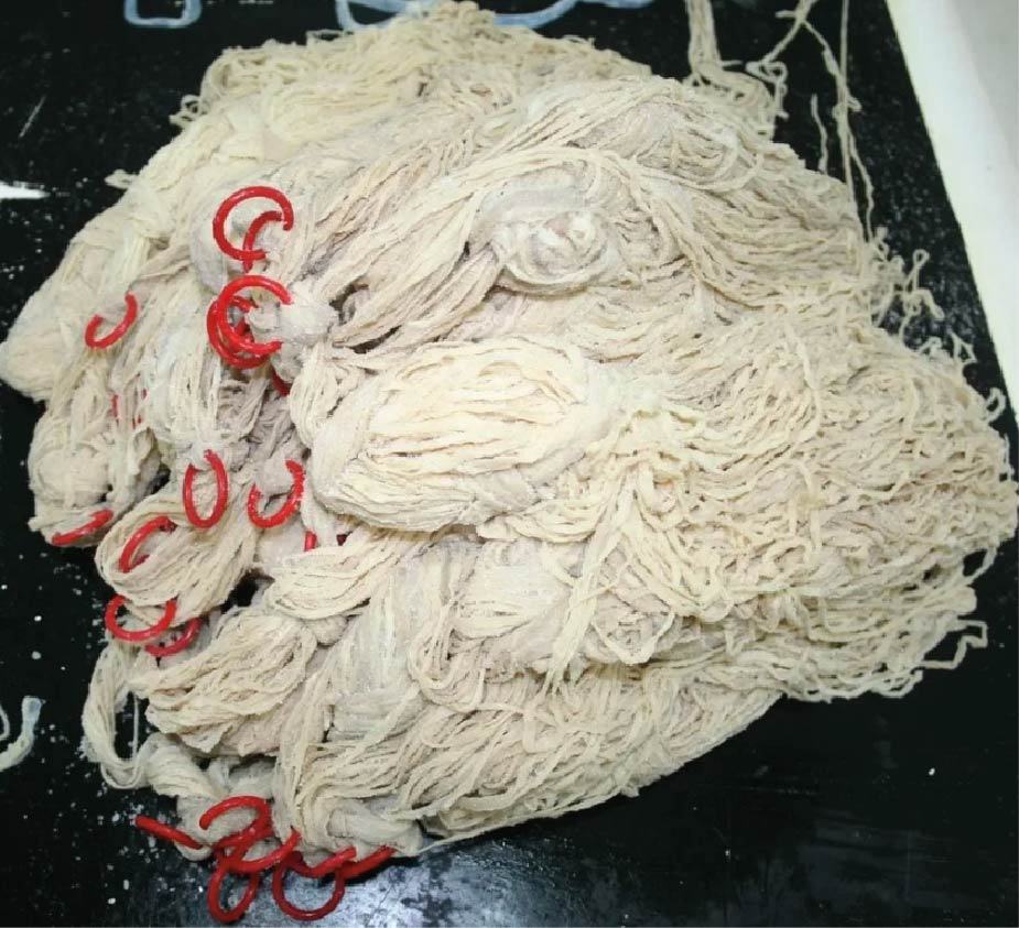 Черевы хорошо очищены от всех оболочек, с крепкими стенками, стабильного диаметра и качества по всем отрезкам в пучке, без пороков и остатков слизистой оболочки. Допускается пыльная брыжеватость (до 0,1мм). Количество отрезков в пучке – не более 17 штук, количество коротких отрезков длиной до 2 м в пучке – не более 2-х. Черевы категории А используются при производстве мясных продуктов с автоматической откруткой сосисок или колбасок на высокопроизводи-