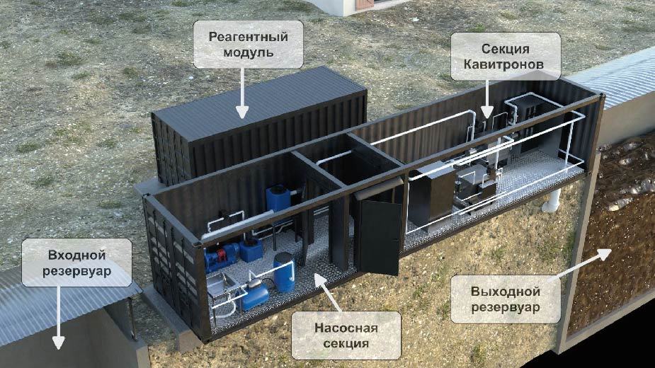 Побочные продукты животноводства поступают из зоны содержания животных во входной резервуар. Далее насосный узел из состава модульной станции закачивает продукт из резервуара и подает по трубам в емкость для смешивания с реагентами (при необходимости). Затем смесь поступает в аппараты вихревого слоя «Кавитрон». В зависимости от требуемой производительности в составе станции может быть от 1 до 3 аппаратов «Кавитрон». Обработанный продукт поступает в выходной резервуар.